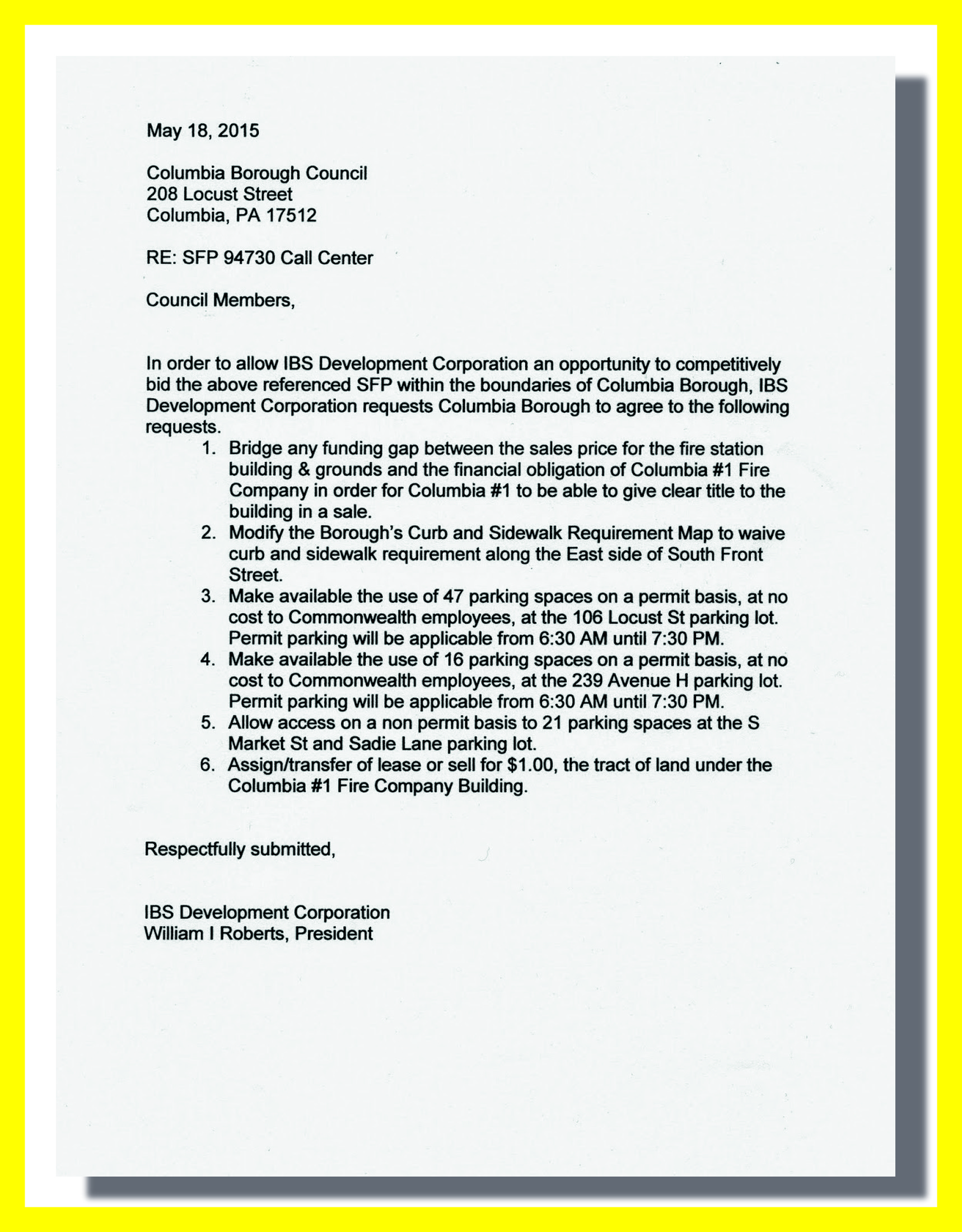 Somehow, an alleged letter from IBS Development Corporation, has surfaced well after the May 18, 2015 Special Council Meeting. The unsigned letter, purportedly written by the president of IBS Development Corporation, William I. Roberts, appears at The Columbia Spy and was distributed to certain sources by via certain persons aligned with the borough.