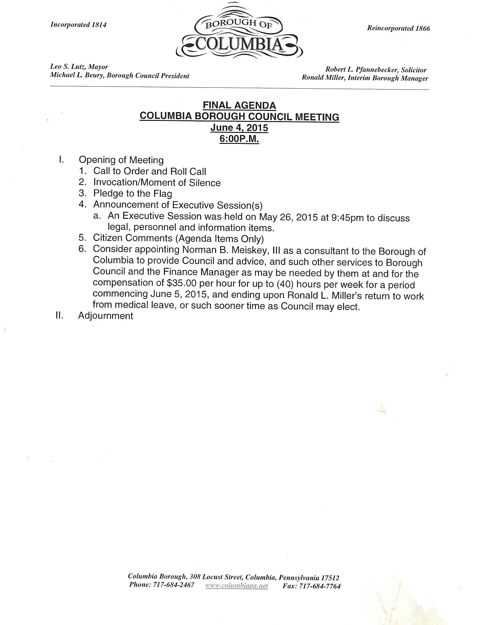 At a specially convened meeting last night, one of Columbia Borough’s former borough managers was returned as an independent consultant to provide guidance and advice until the interim borough manager’s return from medical leave “or sooner.” There is an inaccuracy in the Legal Notice that announced the meeting: the special meeting was to retain a consultant to serve during the interim borough manager’s medical leave … council has not yet appointed a borough manager. Council approved the appointment of Norman B. Meiskey, III.