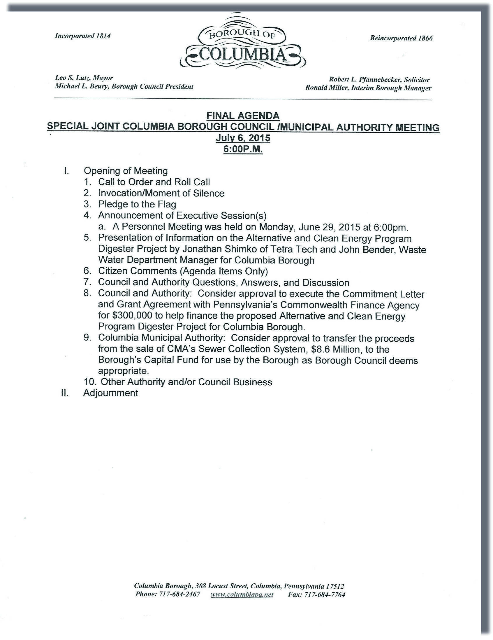 Assembled in the Columbia Borough council chambers for the joint meeting of the Columbia borough council and the Municipal Authority were the seven councillors and four Authority members – Ray McCarty was absent. Council president Mike Buery convened the meeting at 6:02 pm; the meeting was convened at 8:12 pm.