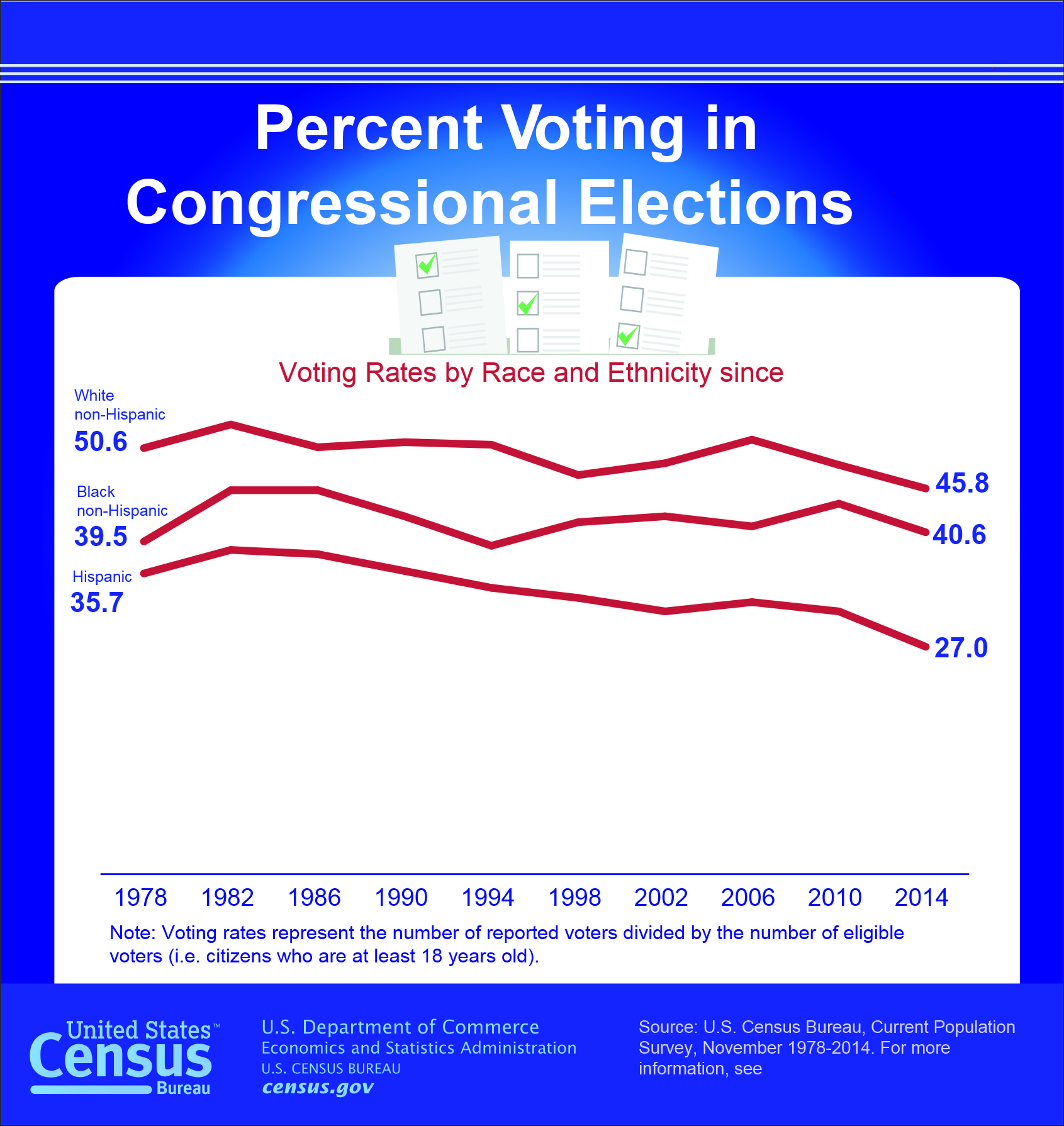 - One reason we get the lousy representation we have – The US Census Bureau reports: “The 2014 congressional election turnout rate of 41.9 percent was the lowest since the U.S. Census Bureau first began asking Americans about voting and citizenship status in 1978. The 2014 voting rate was 7.0 percentage points lower than in 1978 and down from the 45.5 percent that reported voting in the 2010 congressional election.”