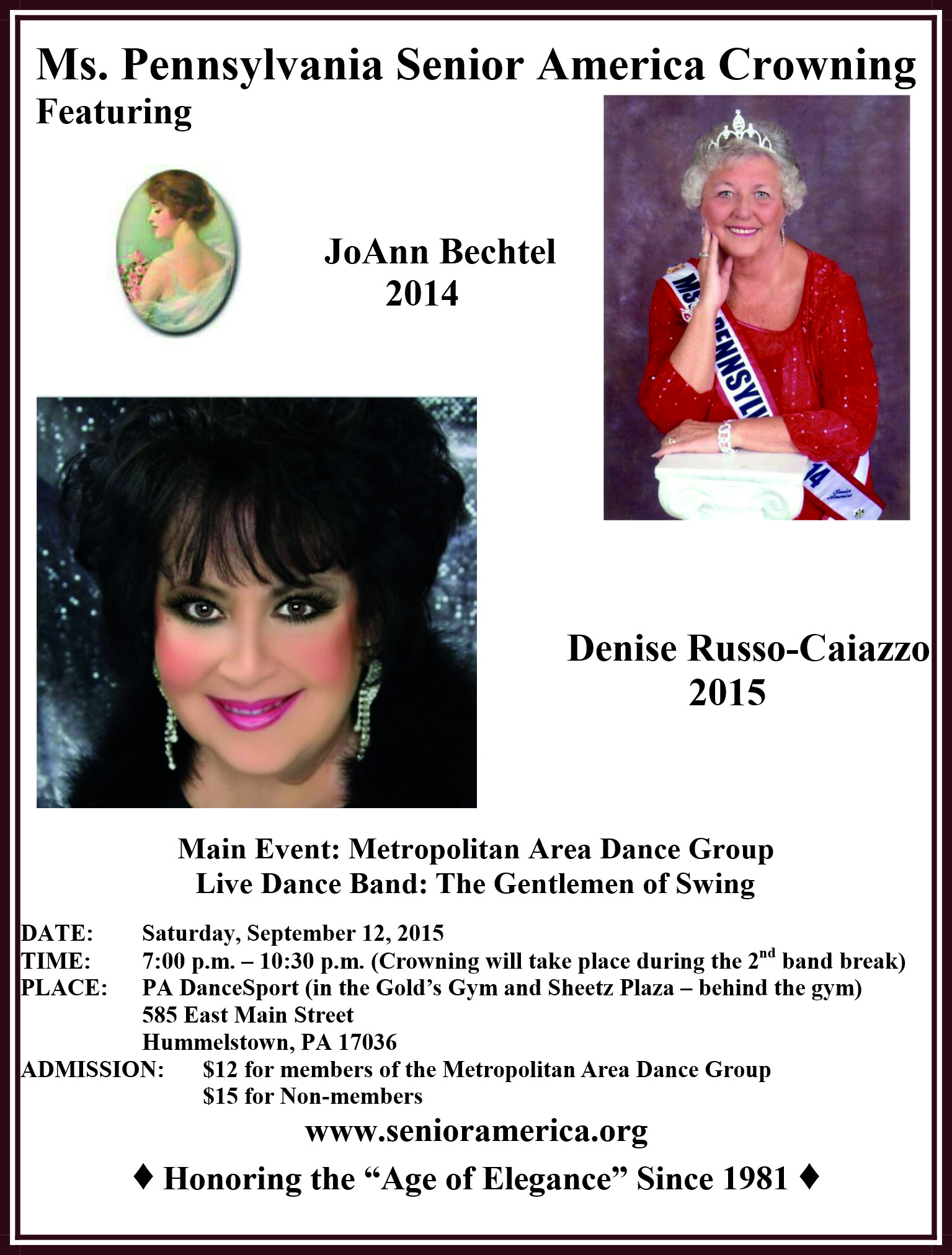 September 10, 2015 17512 Columbia Ms. Pennsylvania Senior America Crowning will be held on Saturday night in Hummelstown http://senioramerica.org/ Share this: Click to share on Facebook (Opens in new window) Facebook Click to share on X (Opens in new window) X Like Loading... Related