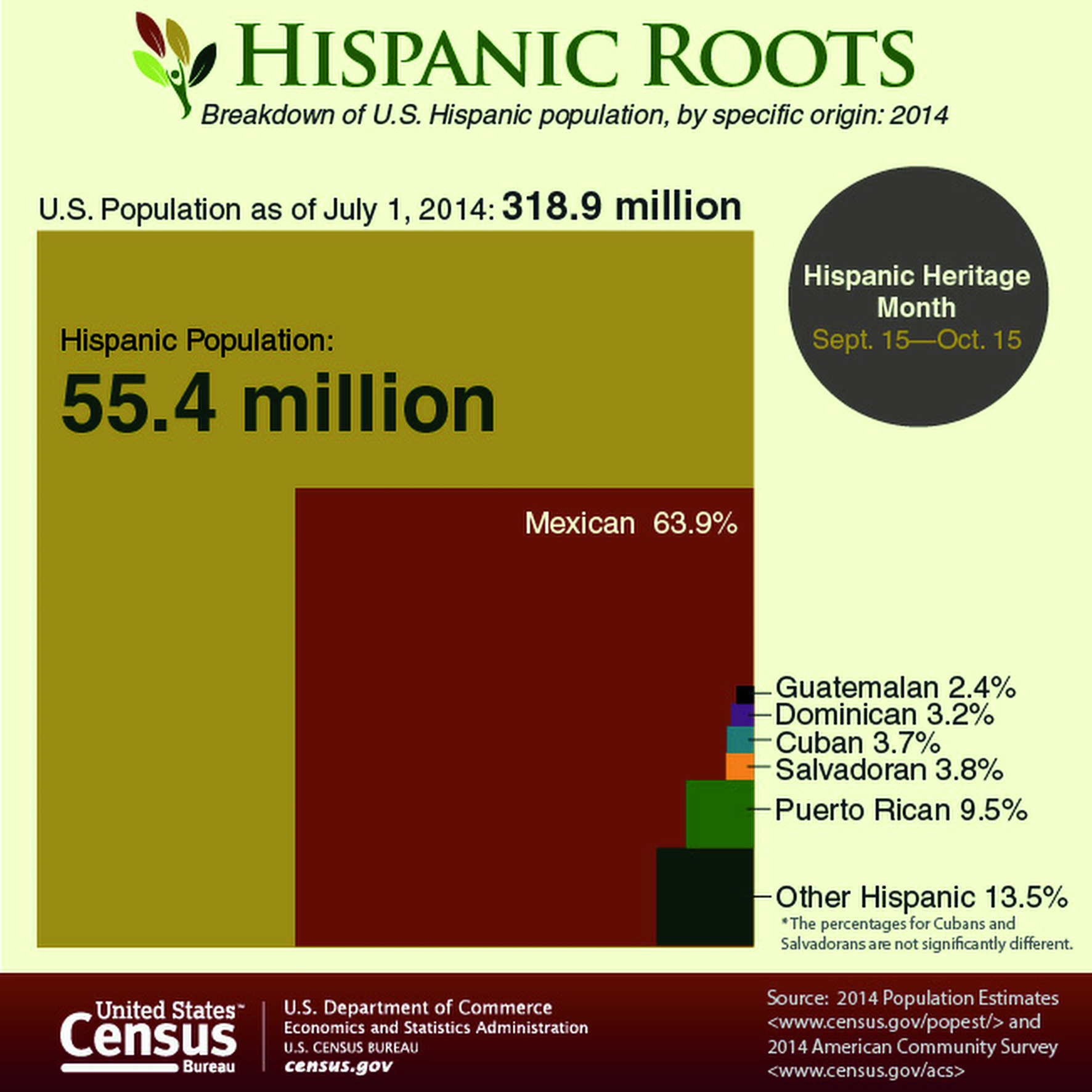 - The Hispanic population of the United States as of July 1, 2014, making people of Hispanic origin the nation’s largest ethnic or racial minority. Hispanics constituted 17 percent of the nation’s total population. – US Census Bureau