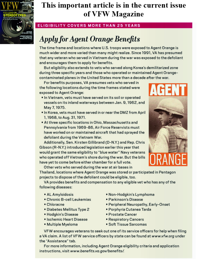 • This is for the Vietnam veteran and veterans stationed near the DMZ in Korea from April 1, 1968 ti August 31, 1971; this important article is from the current issue of VFW Magazine.