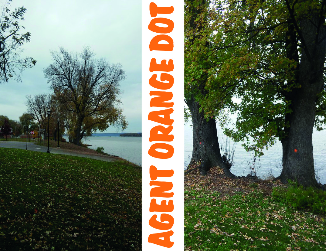 • A week or so ago, Columbia Spy posted several photos of the trees identified for removal at River Park. Seems like nearly every tree nearest the River are “orange dot” identified. This defoliation project surely will change the character of the Riverfront.