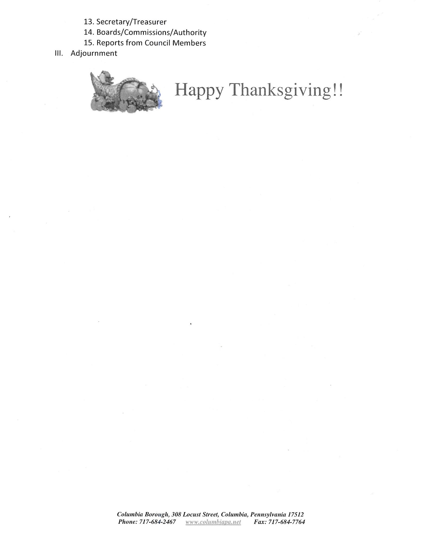 - In a “huh?” discussion, councillors appeared divided in their recollection of discussions about a pet rescue discussion of over a year ago. According to this Lancaster Online article, “Columbia Borough Council heard from two altruistic groups — one offering help, and one needing it — on Monday, March 24.” Last night one of the councillors introduced an agenda item concerning the donation of a parcel of land at the Borough Farm to “Judy McKonly to build an animal rescue.” Discussion ensued and the general feeling was that no clear proposal had been put forth at the March 24, 2014 meeting.The agenda for that meeting appears below; the discussion item is Item I, 5 – Presentation by John F. Markel, Esq. – Animal Welfare and Rescue Organization.”