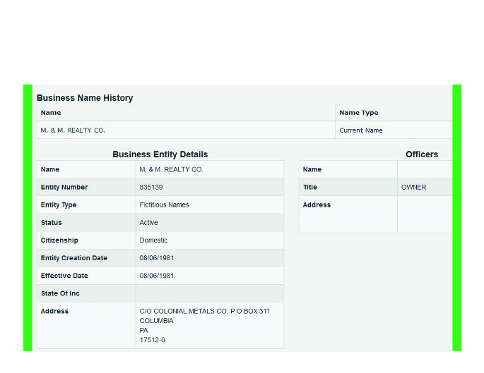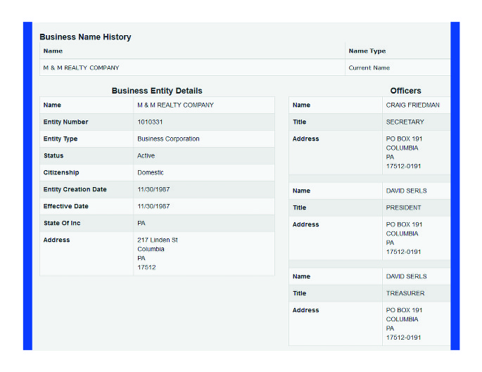 - The Commonwealth’s Department of State corporation’s list shows these listings though for M&M REALTY COMPANY and M&M REALTY CO.