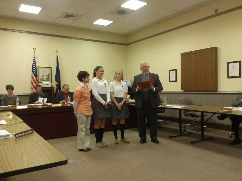 Mayor Leo Lutz recognized Catholic Schools Week by presenting a proclamation to representatives from Our Lady of the Angels School; shown above (from left) are Michele Detz, faculty member and the president and vice president of the Student Council.