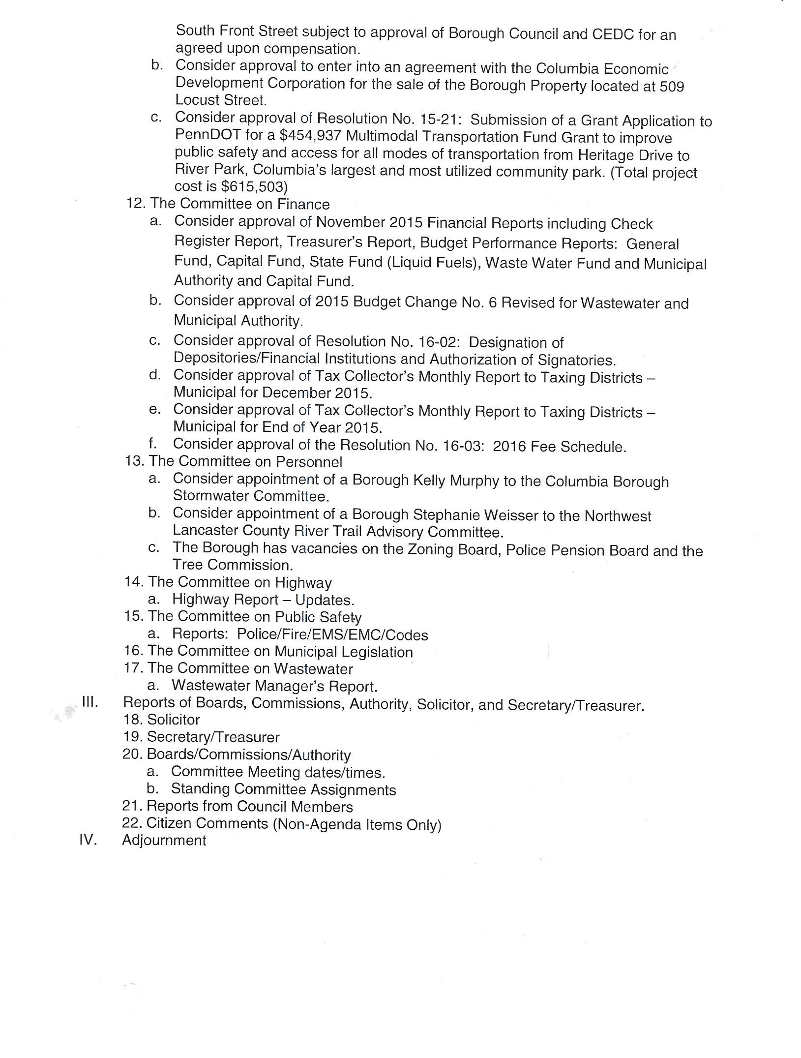 Council president Murphy verbally added an agenda item, Item 14. b. “Consider acceptance of Route 441 turnback upon receipt from PennDOT pending the solicitor’s review and approval.”