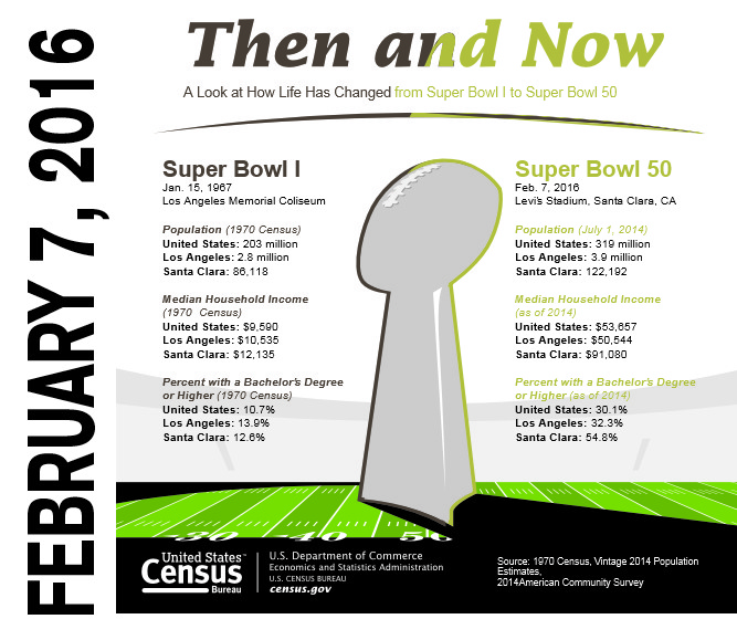 Super Bowl 50 will be played Feb. 7 at Levi’s Stadium in Santa Clara, Calif. The first Super Bowl was played on Jan. 15, 1967, at Los Angeles Memorial Coliseum, with the Green Bay Packers beating the Kansas City Chiefs by the score of 35-10. This will be the second time the NFL’s championship game will be held in the San Francisco Bay Area. In the last one, the San Francisco 49ers beat the Miami Dolphins 38-16 at Stanford Stadium in 1985. – SOURCE: US Census Bureau