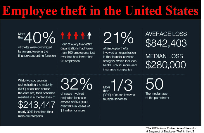 This report, The 2015 Hiscox Embezzlement Watchlist: A Snapshot of Employee Theft in the US, notes: