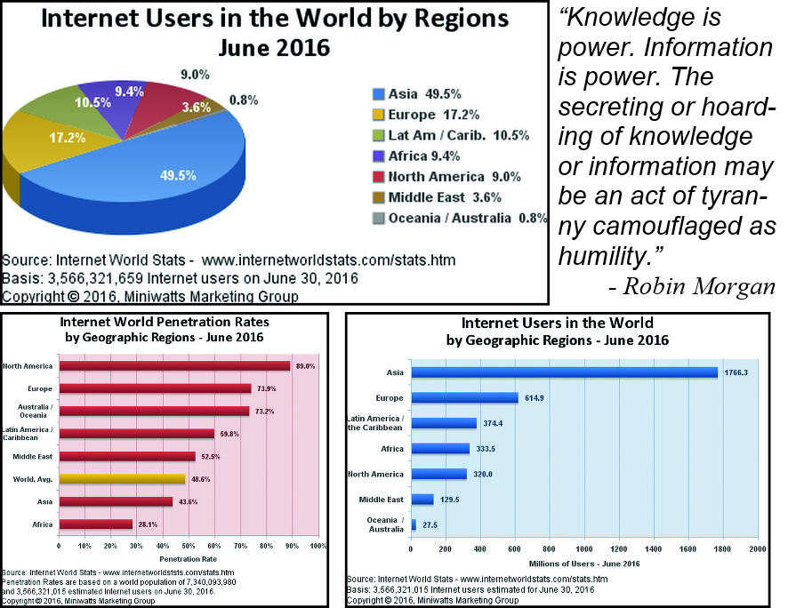 As the Internet continues to expand the information, knowledge and, ideally, the communication base across the globe, the data shared in this Internet World Stats report shows the global nature of information, knowledge and communication-sharing.