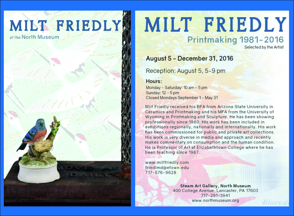 July 17, 2016 17512 Columbia Milt Friedly, Co-Owner, Curator and Director of the Susquehanna Center for the Creative Arts will show his Printmaking at the North Museum, Lancaster, PA. SOURCE: submission Share this: Click to share on Facebook (Opens in new window) Facebook Click to share on X (Opens in new window) X Like Loading... Related