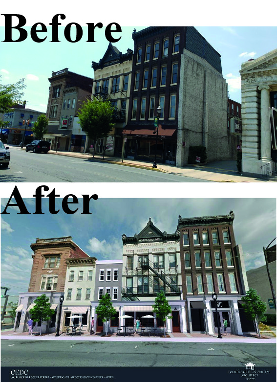 The street scape afterward is gorgeous, no doubt. Problem is, the properties (Hotel Locust and Hotel Columbia) are shown after a re-do, as are the two properties to the left. Lord knows, the four properties desperately need a re-do.