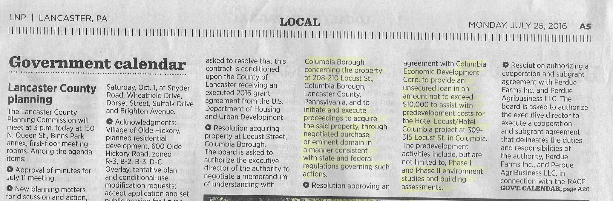 1. In today’s LNP (July 25), on page 5, the Lancaster County Housing Auth. will be dealing with resolutions concerning properties in the borough. One is 208-210 Locust St. and the second resolution deals with the Hotel Locust project. Meeting is 4:30, Tuesday, July 26.