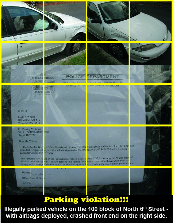 A reader sent these pictures and note: “No. Just showed up in the neighborhood Tuesday. Lots of Police activity all eve – they kept checking on it. The next day the notice was taped to the window. You did notice that the air bags were deployed, front window cracked, flat tire, out of insp. and fender damaged. Wondering how it got driven here in this condition. None of the neighbrs know anything was hit “around here.