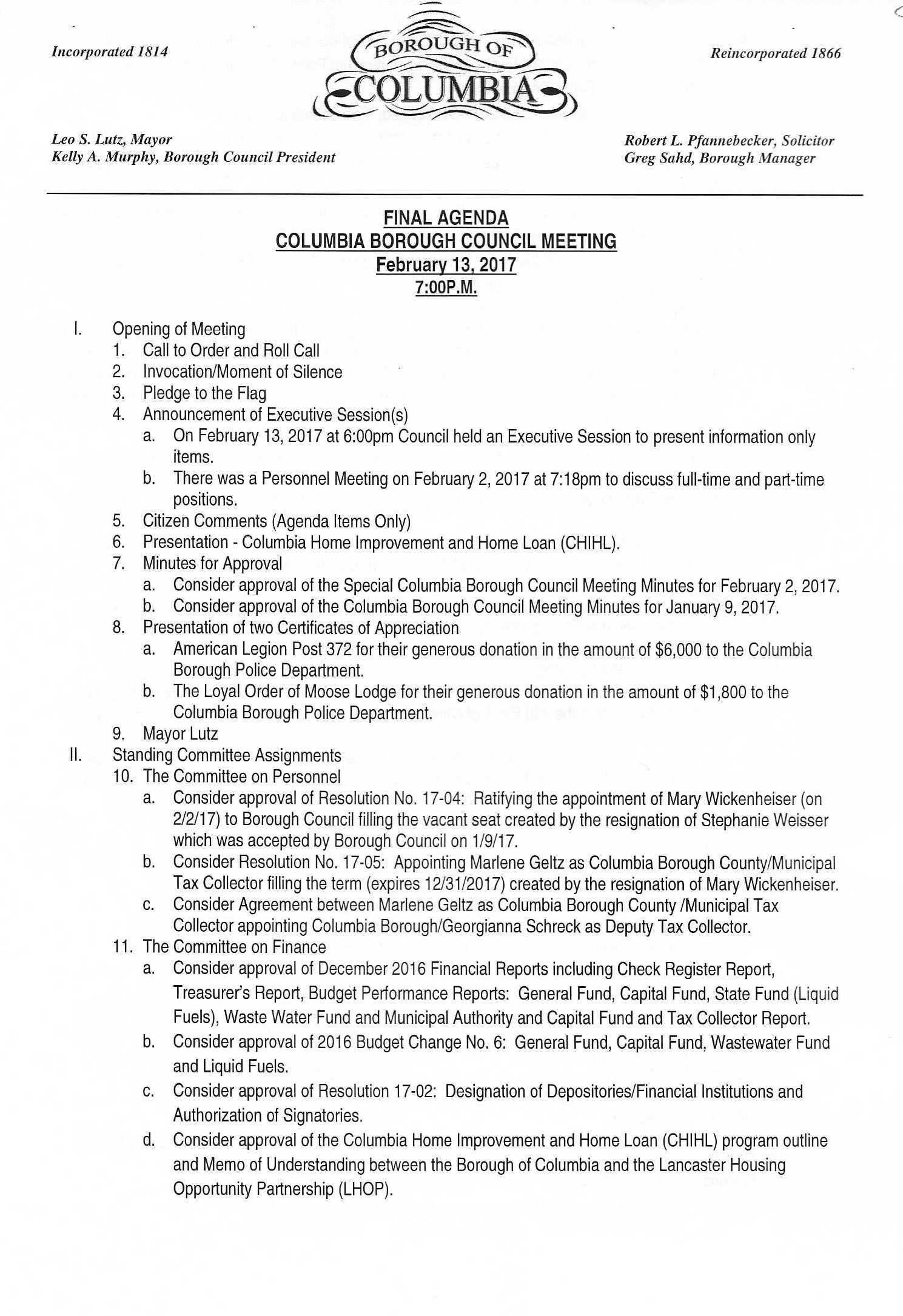 - Representatives from the Lancaster Housing Opportunity Partnership (LHOP) introduced the Columbia Home Improvement and Home ownership Loan Program. Chief Executive Officer, Ray D’Agnostino and Fran Dannis, Chief Operating / Lending Officer facilitated a Power Point program overviewing and explaining the scope of the program. The two-parted program provides well-below market rate interest rates for home improvement and home ownership loans. Council president Murphy stressed that these programs are the result of year-long planning and discussions among the partners in the project.