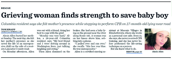 Quote for today … “Around 3:45pm today right by the washington boro park Alexis Allen and i spotted a mother and 17 month old boy in trouble! The baby was not breathing and non responsive! Lexie quickly performed CPR and after about 1 minute the baby was revived!” – Beginning of a string at this facebook page, “You know you’re from Columbia PA if…” on March 27. Today, the article about Alexis Allen’s heroic actions are a top-of-page one LNP – Always Lancaster article.
