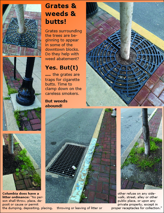 Regarding the tree grates: The shade tree commission did not want them, but some members reluctantly gave in. We had tree grates before and they did not work out that is why they were removed. The sidewalks here are not wide enough to properly accommodate the trees let alone grates and bricks. Every street has sidewalks that are lifting up due to tree roots. They present a tripping hazard and are difficult for those using wheelchairs to maneuver. Since we now have the tree grates, they must be maintained and that means trash removal including cigarette butts. Over this past weekend I saw trash sticking up out of the top of cans on Locust Street. The Mayor said last year that they were going to catch those that are tossing household trash in the containers. What does this look like to those visiting Columbia? Over in the small parking lot at North Fourth and Walnut Streets, there are very large piles of dog feces on a daily basis. Why pay $65,000 a year for a consultant to help with our “streetscape” when the basics like trash removal and feces pick-up are not being done. The alley to the rear of the Turkey Hill store on Chestnut Street looks like a landfill or dump for months and months now. Another section of that alley has hundreds of cigarette butts piling up and I do mean hundreds. We just purchased a new street sweeper, so why not run it through the alleys once in a while, even every couple months. That alley has not been touched in at least the last nine months.