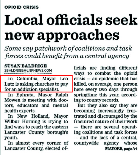 - During a June 7, 2016 “communication conversation” about the opioid issues in Columbia, “Mayor Leo Lutz … promised that Columbia’s resources would galvanize to confront the onslaught and to work with citizens to provide help for those addicted to the illness.”