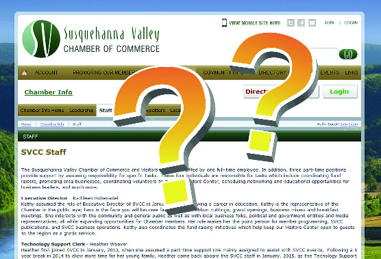 Last Saturday, we asked, “And what’s up with the Susquehanna Valley Chamber of Commerce? This signature line was on an email received yesterday: ‘Beverly J Shank, Executive Director.’ Yet this is what’s listed at its Website: ‘Executive Director – Kathleen Hohenadel.’” That’s yet unchanged. Hello, is anyone there?