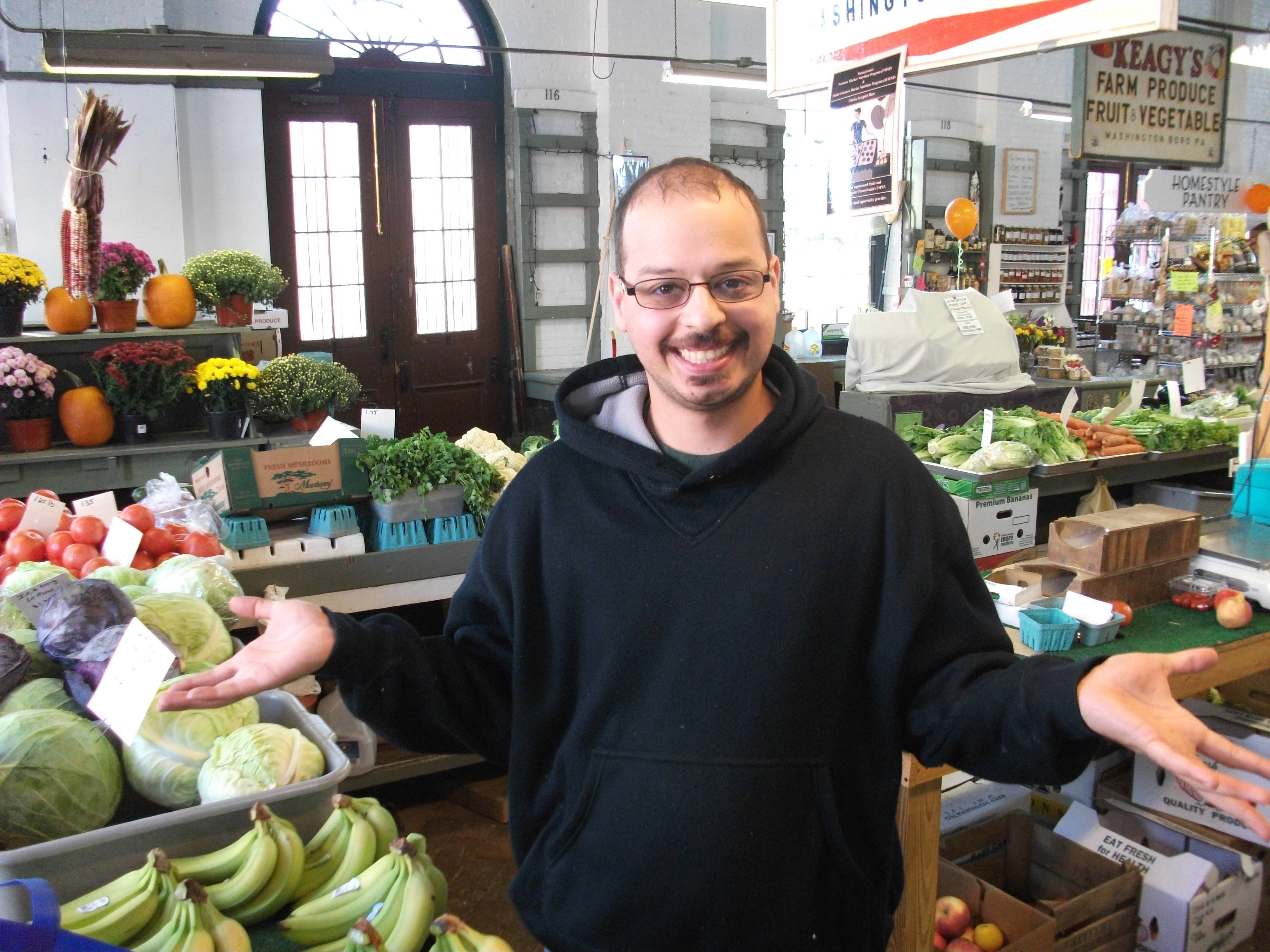 Before opening the Locust Street store, Bob was the largest stand holder at the Columbia Historic Market House for many years. Among our trove of Market House photos from the last half of 2010, we found these fond photos of Bob working at Keagy’s Produce stand at the Market House