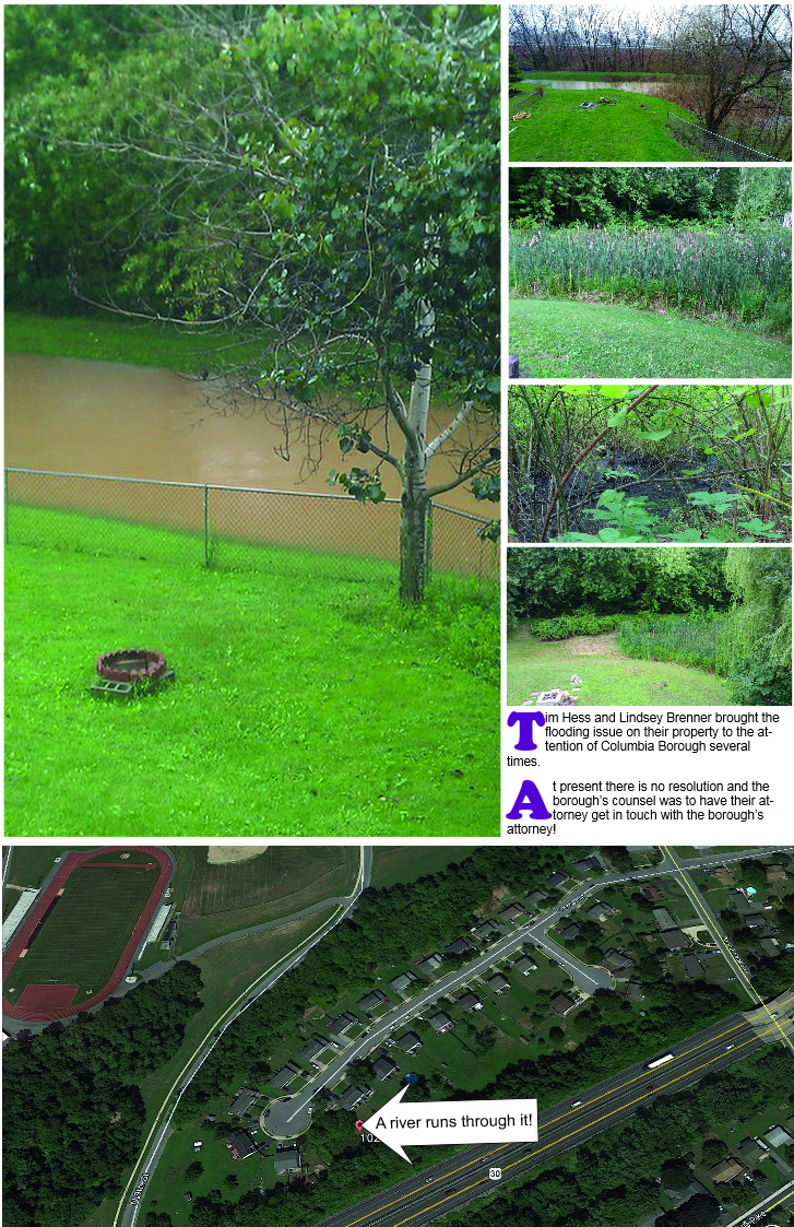 Columbia property owners, Tim Hess and his wife, Lindsey Brenner, were on the agenda (click to listen to the portion of the agenda in which the exchange between Hess and Brenner and the borough representatives at the Monday night borough council meeting. They’ve spoken at council meetings several times before as they have tried to plead their concerns about the flooding behind their property at 1020 Cloverton Drive.