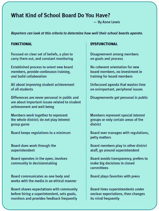 Take a look at the graphic above “What kind of school board do you have?” Look at the second to last characteristic. Does the board play favorites with press? Maybe.