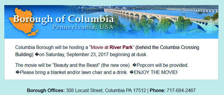 Another borough e-blast reminding citizens about Saturday’s “Movie at River Park.”