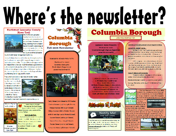 At the recent borough council meeting, the borough newsletter was listed as a communication initiative. September’s reaching the two-thirds’ gone mark and no Fall newsletter is it yet available online. In the two previous years, the Fall newsletters were posted in early September.