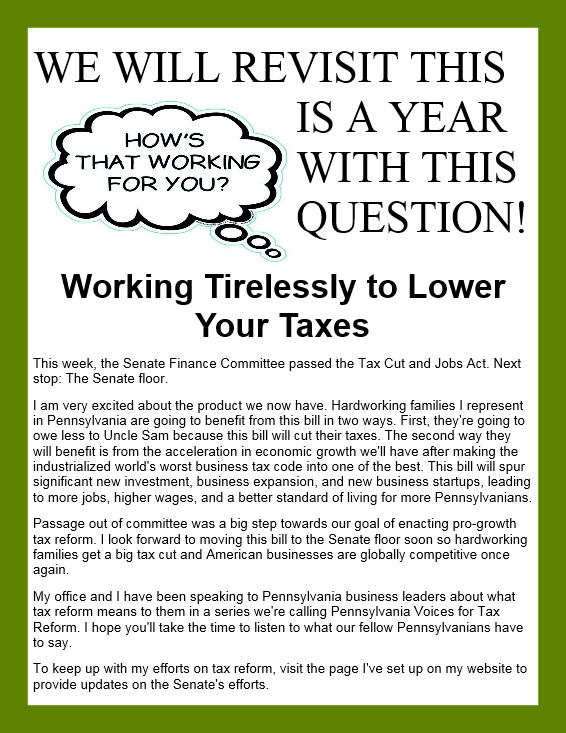 The Pennsylvania GOP Senator is “Working Tirelessly to Lower Your Taxes” he claims in an email to constituents. Read more at his Webpage: Pennsylvania Voices for Tax Reform. Or for more updates on the Senate’s efforts.