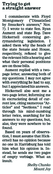 Letter writer not happy with legislator’s response. In today’s LNP – Always Lancaster‘s letters to the editor, this is one that takes issue with rote responses.