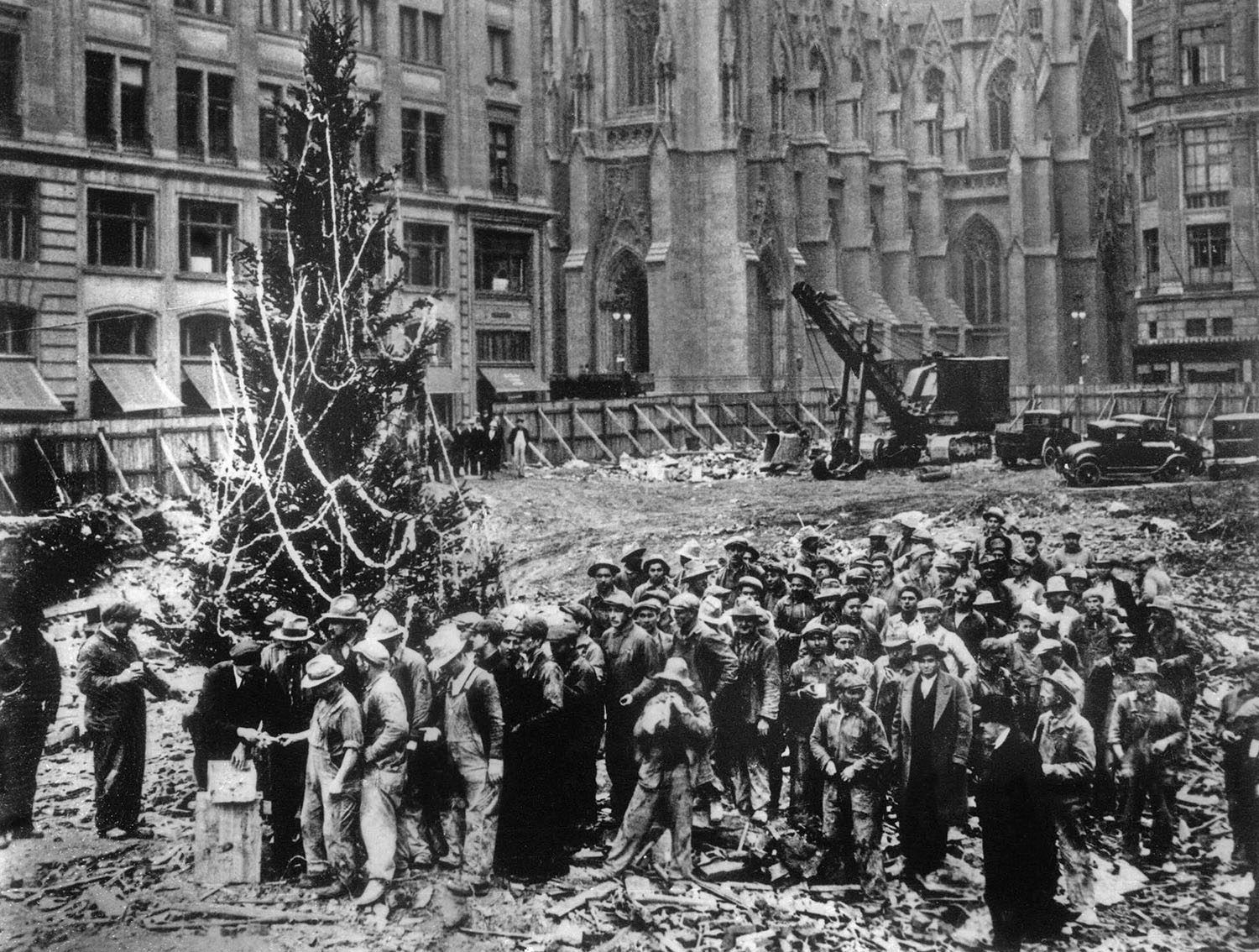 “The first Rockefeller Center Christmas tree. Construction workers line up for pay beside the first Rockefeller Center Christmas tree in New York City in 1931.”