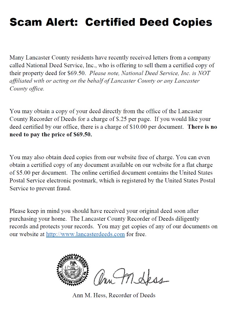 Click on the above graphic to enlarge this SCAM ALERT found at the County’s Recorder of Deeds page.