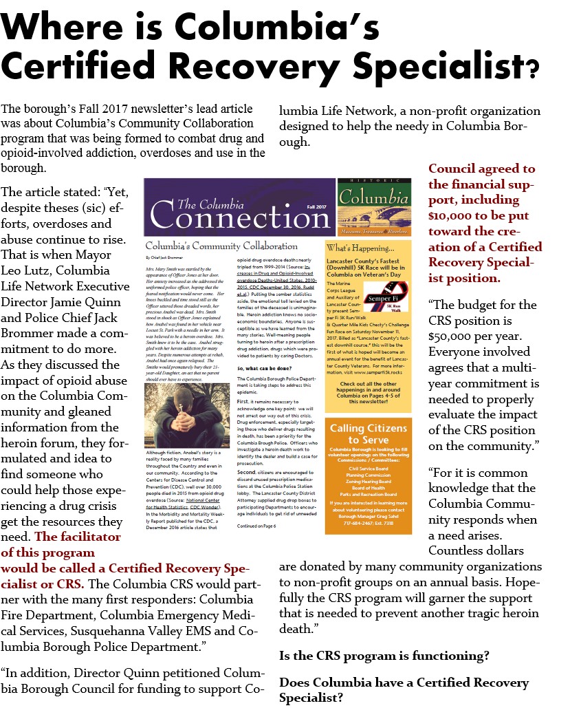 Yesterday, this Lancaster Online article about synthetic derivatives spotlighted Columbia in the headline and stated, “‘The use of synthetic cannabinoids/K2 in Columbia has been prevalent for years,”’ borough police Detective Matthew D. Leddy said in an email. ‘Our patrol officers are exposed to users of synthetic cannabinoids on a regular basis.’”
