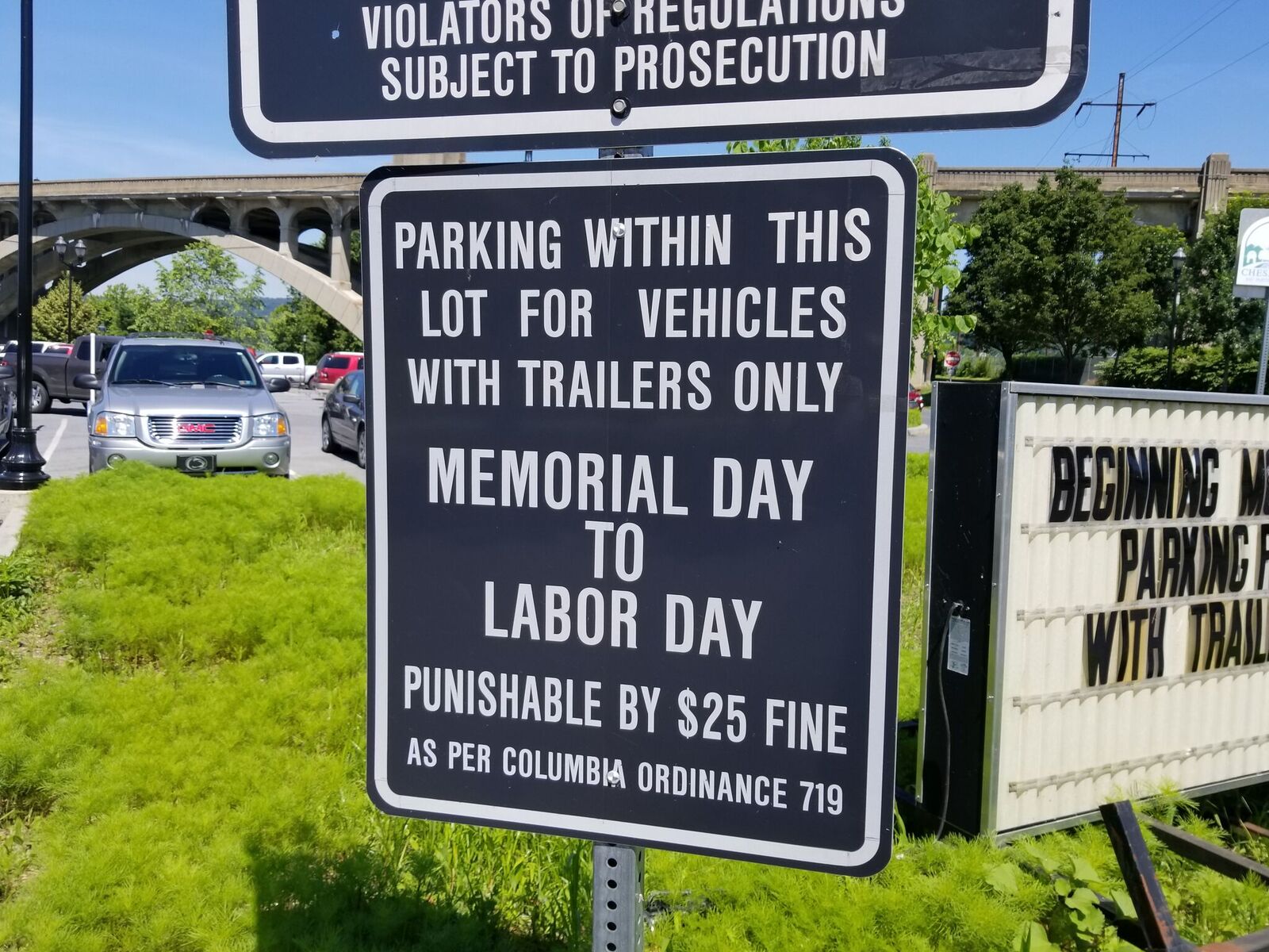 The welcoming warning signs do not describe what kind of trailers may park.
