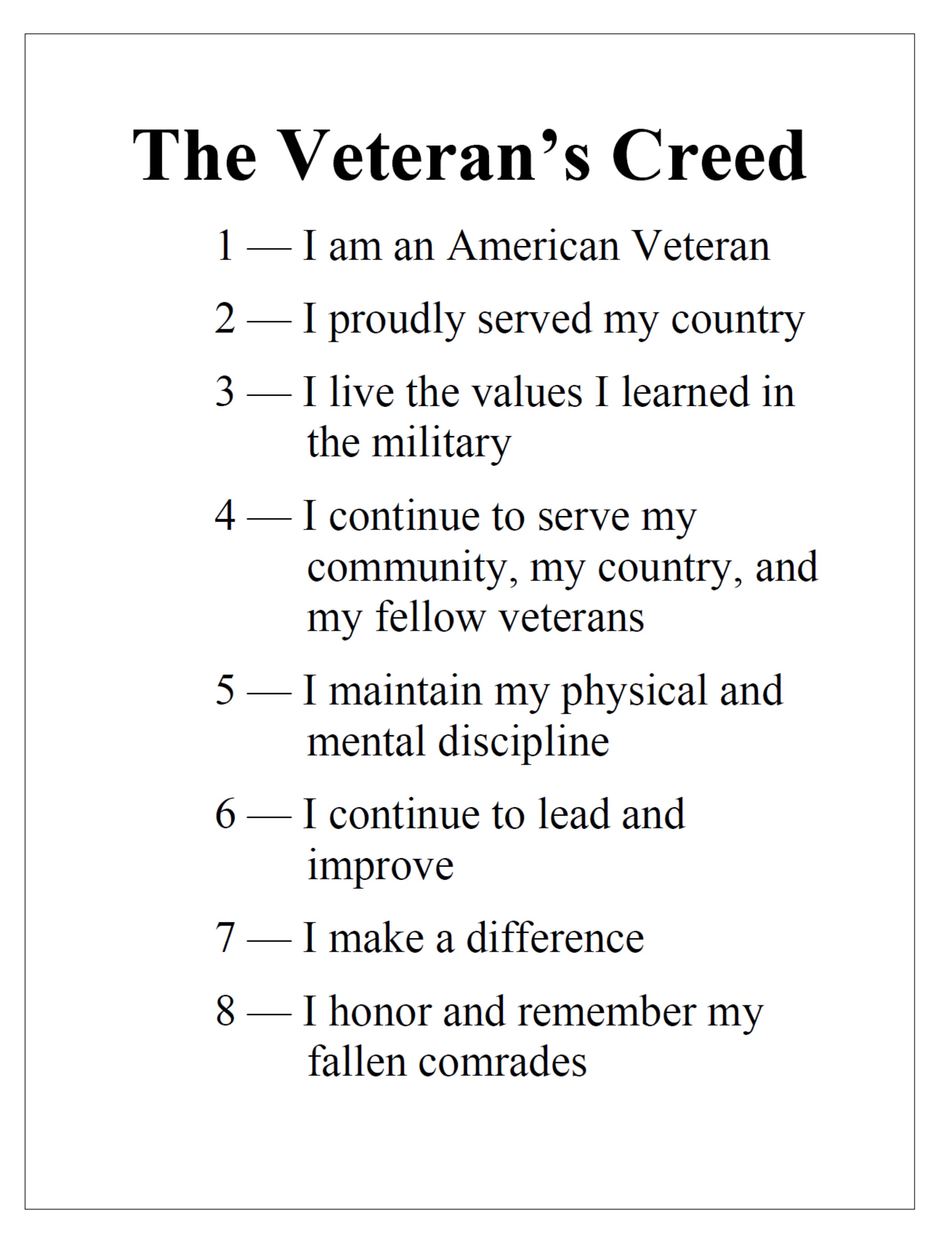 “The Veteran’s Creed is a grass-roots effort, which has been endorsed by many of the national veterans service organizations. Organizers behind the project said their goal was to provide a rallying idea for the larger veterans community, which they believe is needed given the disconnect many veterans feel with their communities upon leaving the military.
