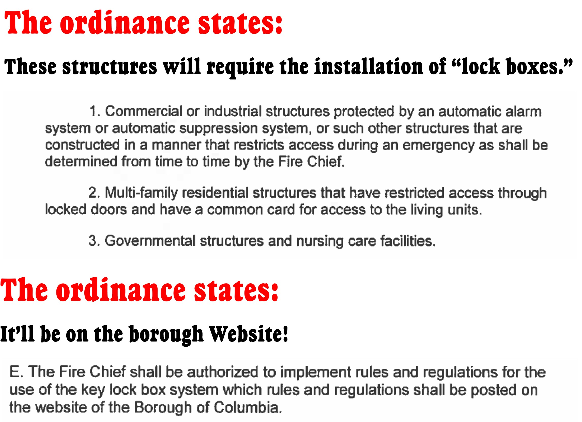 Notice that Knox Box states at this Webpage, “Many fire departments using the Knox System have been successful in passing a city ordinance to help implement a public safety program for rapid entry. Knox offers guidelines and sample ordinances to help other interested departments gain ordinance approval. Guidelines include: