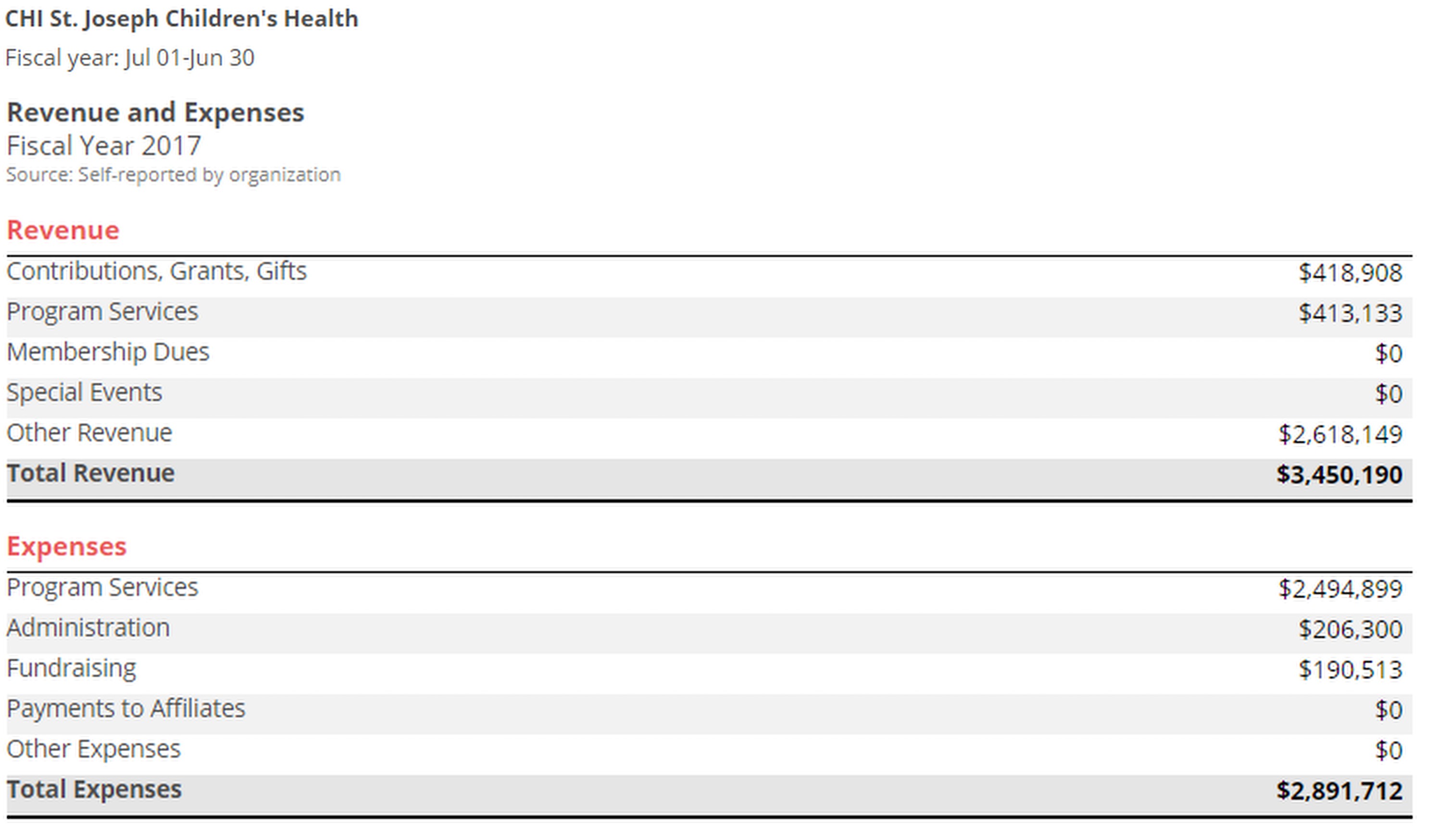 CHI St. Joseph Children’s Health’s 2017 revenue and expenses are shown here: