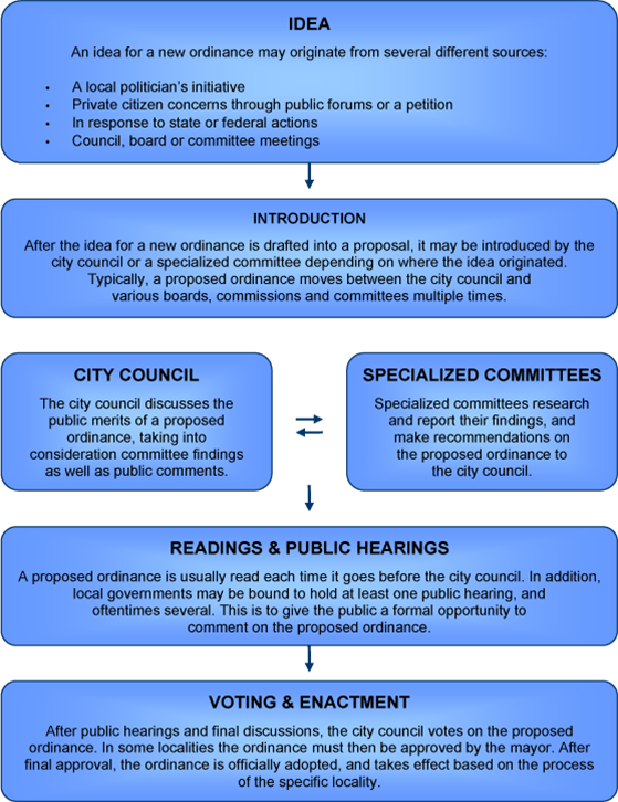 “An ordinance is the name typically used for a law passed by a local political subdivision, such as a city, county, village, or town. Ordinances may address a wide variety of local issues, from local government structure to speed limits and sign sizes. The process for passing an ordinance is determined by the laws of each individual state, though there are many similarities between states. The diagram below portrays how the ordinance process generally works.”