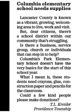 columbia needs suppliesLetter to the editor in today’s LNP – Always Lancaster.