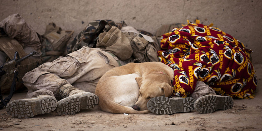 “Lance Cpls. Matthew Scofield (left), 19, from Syracuse, N.Y., and Jarrett Hatley, 21, from Millingport, N.C., a squad automatic weapon gunner and an improvised explosive device detection dog handler with 3rd Platoon, Lima Company, 3rd Battalion, 3rd Marine Regiment, rest next to Hatley’s dog Blue after clearing compounds with Afghan National Army soldiers during Operation Tageer Shamal (Shifting Winds) here, Jan. 4. – U.S. Marine Corps/Cpl. Reece Lodder