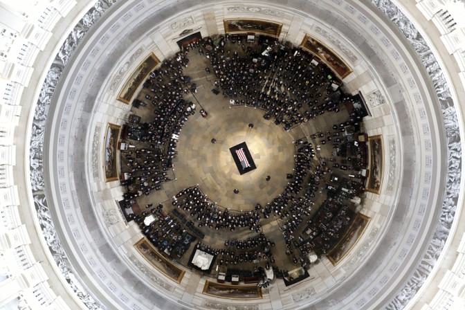 “The flag-draped casket of Senator John McCain lies in state on the Lincoln Catafalque in the Rotunda of the U.S. Capitol. – Morry Gash / AP”