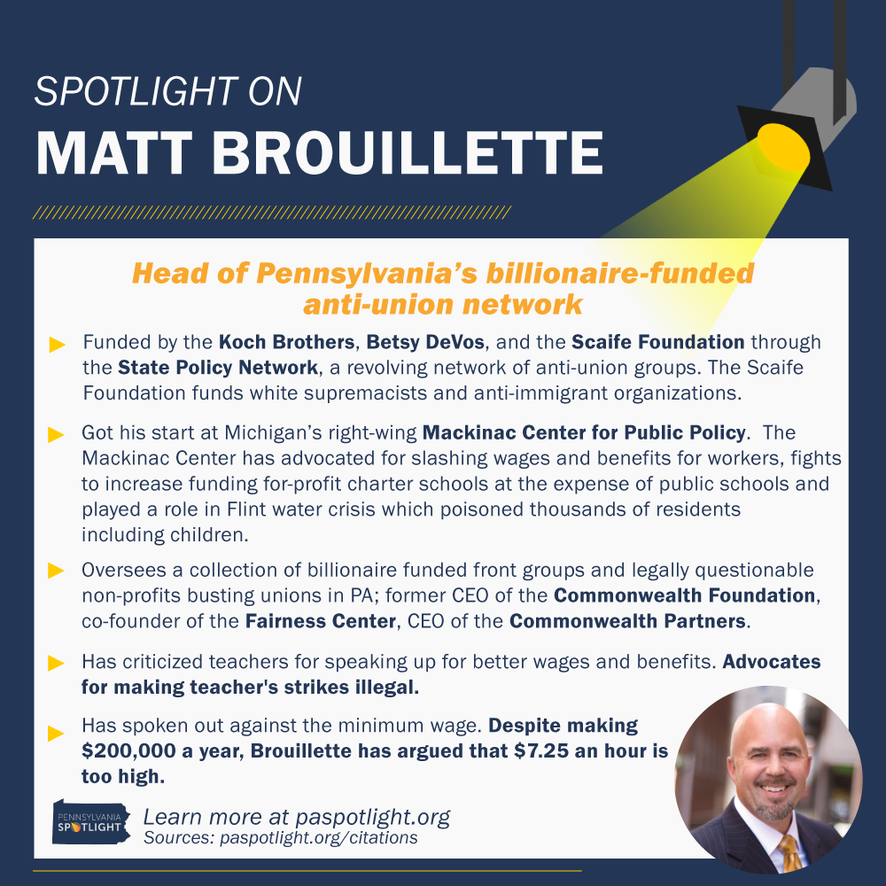 “Funded by the Koch Brothers, Betsy DeVos, and the Scaife Foundation through the State Policy Network, a revolving network of anti-union groups. The Scaife Foundation funds white supremacists and anti-immigrant organizations.