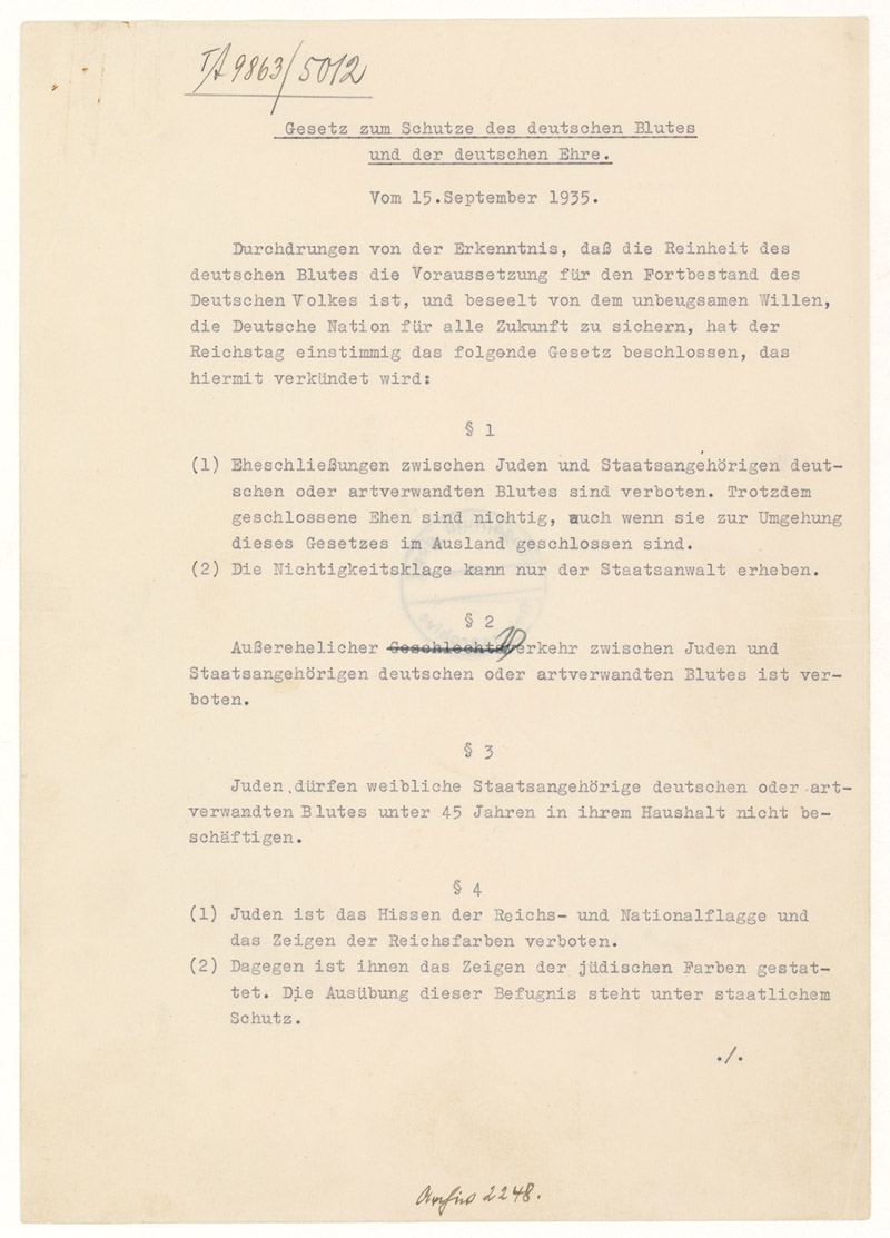 “Law for the Safeguard of German Blood and German Honor barred marriage between Jews and other Germans.” (National Archives Gift Collection)
