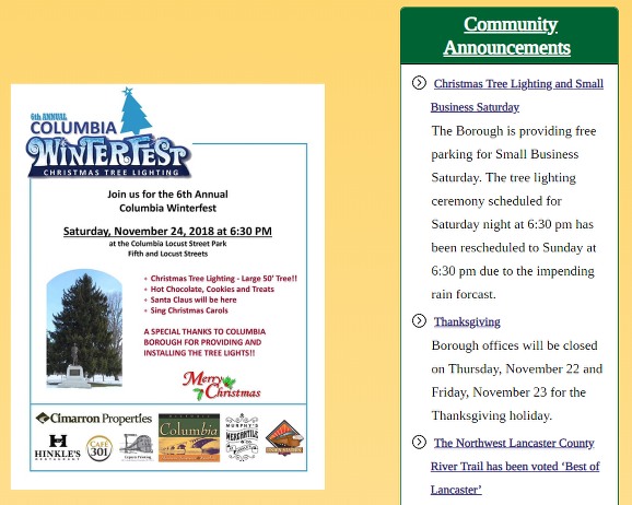 “Christmas Tree Lighting and Small Business Saturday | The Borough is providing free parking for Small Business Saturday. The tree lighting ceremony scheduled for Saturday night at 6:30 pm has been rescheduled to Sunday at 6:30 pm due to the impending rain forcast (sic). –