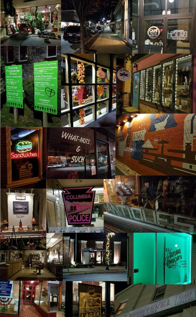 Also seen last Sunday evening before the tree lighting, holiday themes are part of several of Columbia’s store fronts at night.