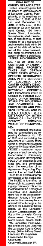 LEGAL NOTICE (above) in today’s LNP – Always Lancaster | At last night’s council meeting, Ordinance 908 (expansion of the Keystone Opportunity Expansion Zone was approved by council. It’s next test will be at the next School Board of Directors’ meeting. According to the Pennsylvania Department of Revenue Website, “Keystone Opportunity Zones (KOZ) and Keystone Opportunity Expansion Zones (KOEZ) are geographic areas that can provide specific state and local tax benefits. The goal of the KOZ/KOEZ program is to revive economically distressed urban and rural communities with one of the most powerful market-based incentives – eliminating taxes.”