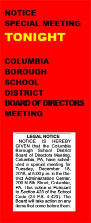 KOZ vote | Here’s the meeting announcement just under the wire published as a LEGAL notice in today’s LNP – Always Lancaster — the one that will provide tax abatement advantages for some. The borough previously approved a similar measure. Depending on which iteration of last week’s School Board meeting agenda you may have downloaded, this was or was not an included item. See all three versions posted at random times; none of the posted agendas identified which superseded the other.