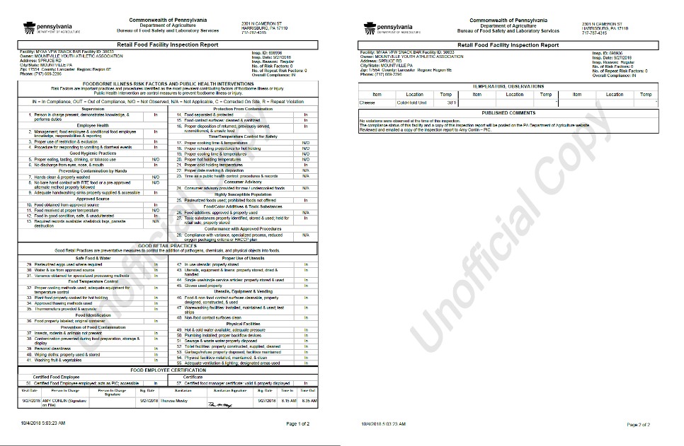Look alike inspections | Notice how all Columbia’s home-made food serving inspections tend to look the same? Below is a recent inspection form (for the Mountville VFW) that the state’s Department of Agriculture uses for all other food serving establishment inspections. And these forms are online so all Customers every where can see the outcomes.