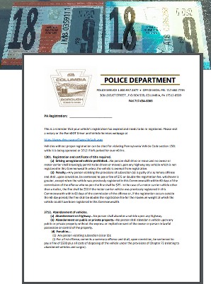 Out-of-date registrations crackdown | Columbia Police Department identifies “Approx. 50 vehicles” that have out of date registrations “between 02-15-19 and 02-16-19. Some of the vehicles posted were not currently inspected as well.” – Columbia Police Department CrimeWatch